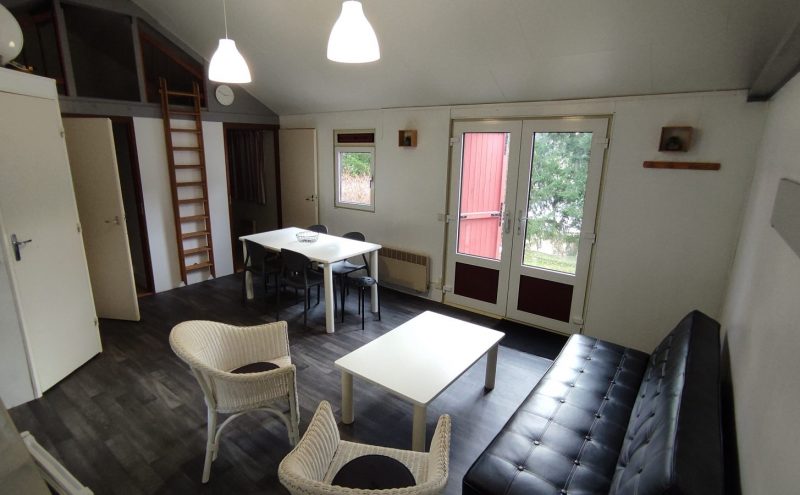 Séjour, Banquette convertible, Cuisine ouverte sur Terrasse avec Plaque de cuisson 4 feux gaz, Frigo, Micro-ondes, Cafetière, Douche et Lavabo, WC